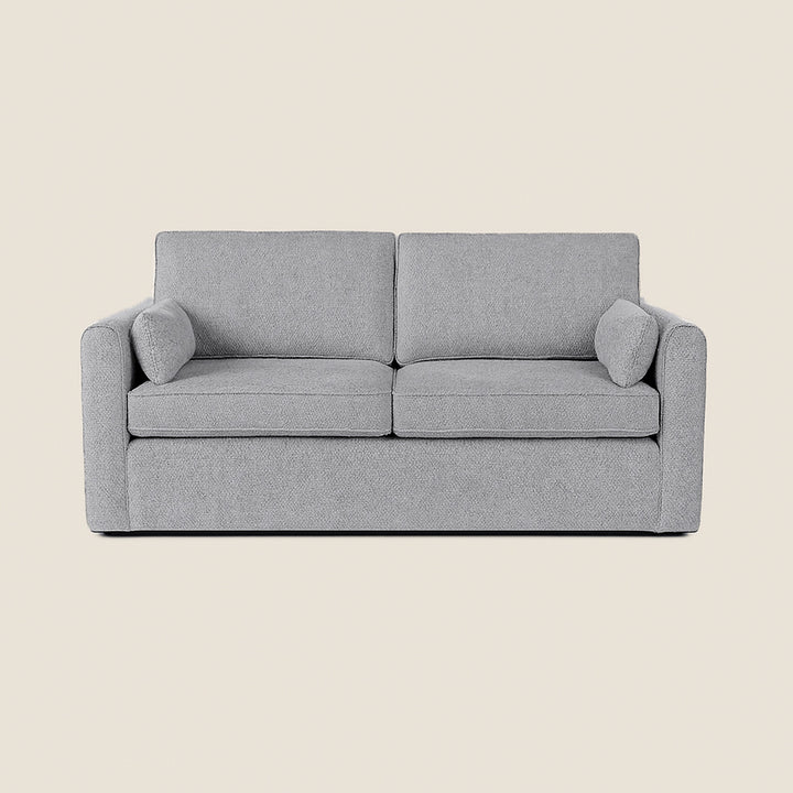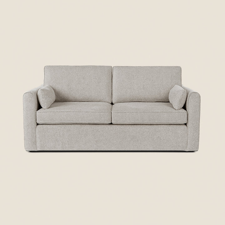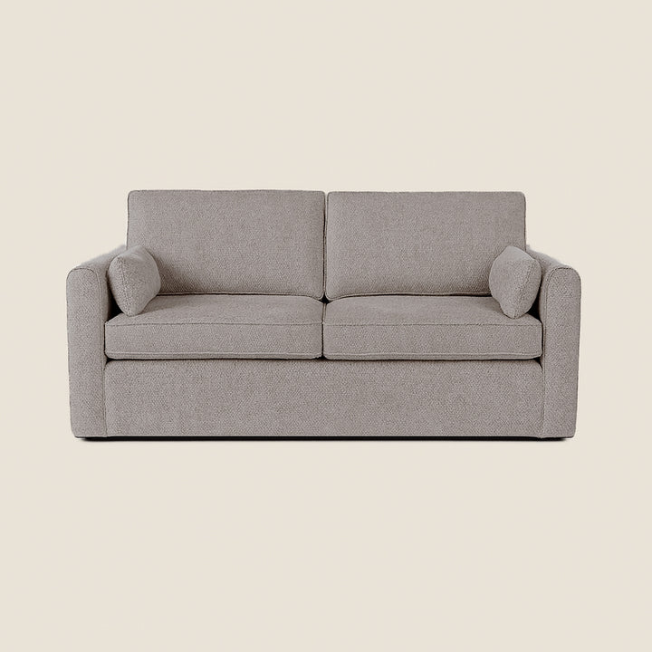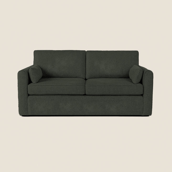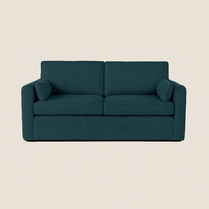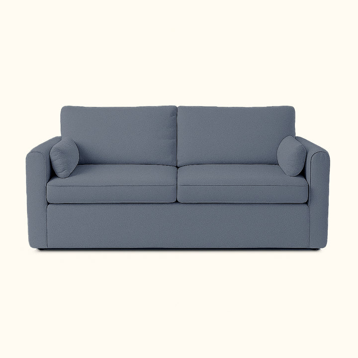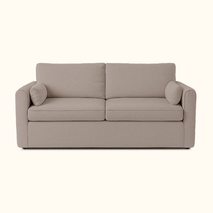 Fully upholstered sofa bed with rounded top arms, and rectangular pillow arm bolsters. Suitable for domestic and contract subject to foam and fabric selections