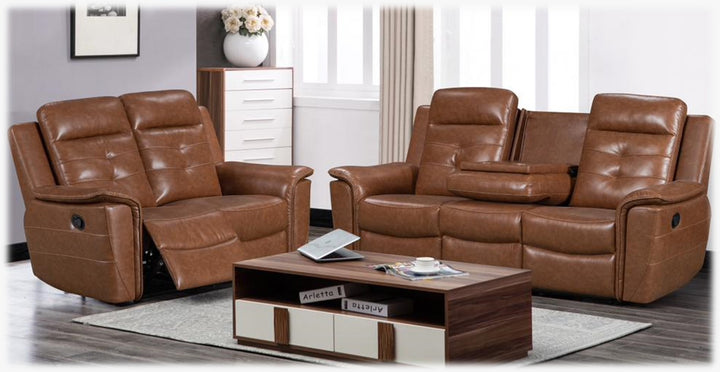The Vegas 3+2 manual recliner sofa set, crafted from durable leather Aire, is in high demand due to its blend of comfort and style. This set is available in warm tan and offers both functionality and aesthetic appeal, making it a popular choice for any living space.